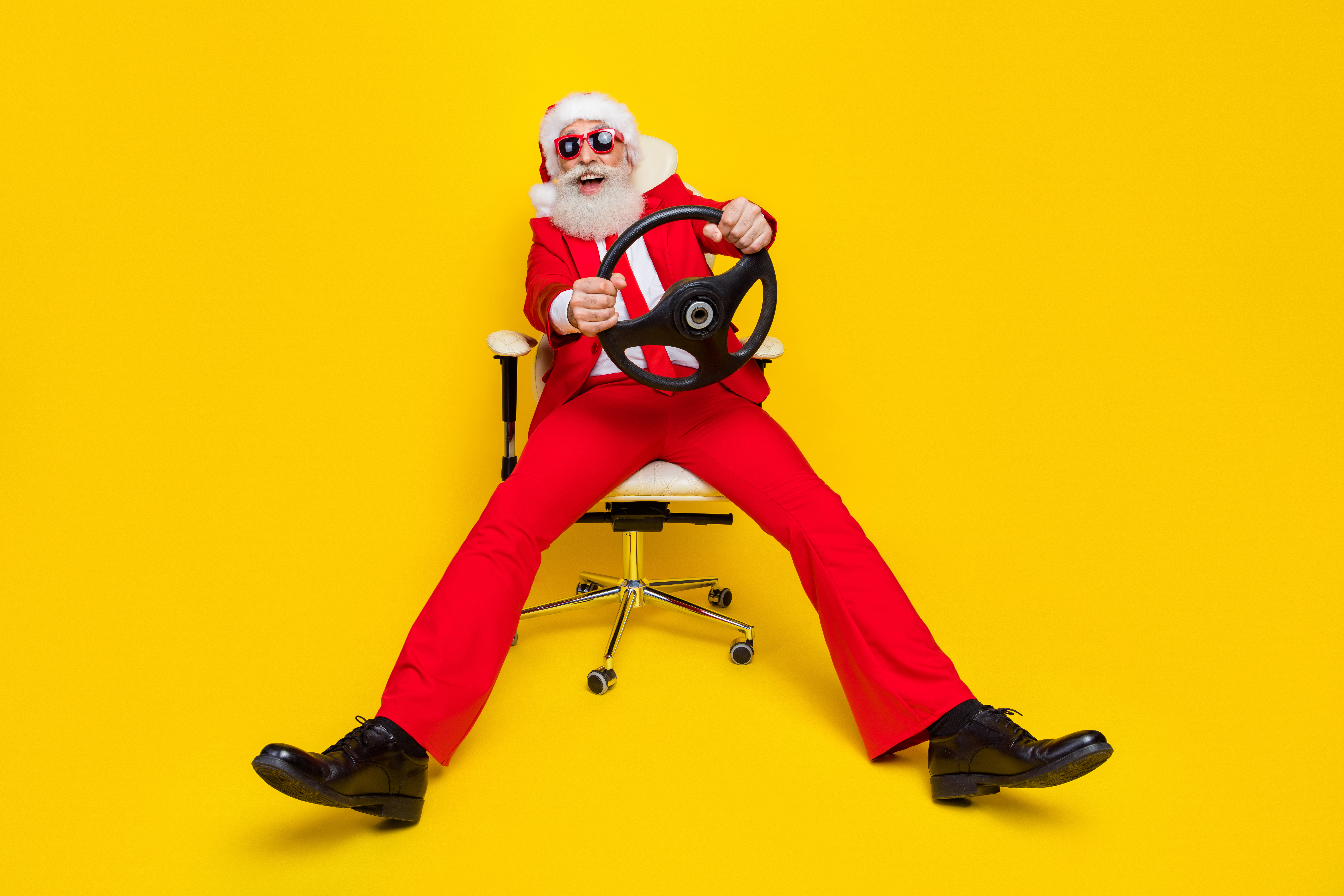 Woman in Santa hat and swimwear posing on a beach with a convertible.